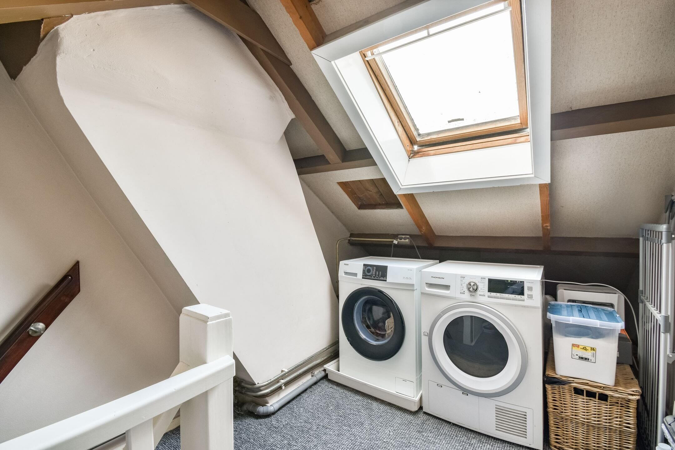 De voorzolder met dakraam herbergt de witgoedaansluitingen. Ruime vierde slaapkamer met dakkapel en vaste bergruimte.