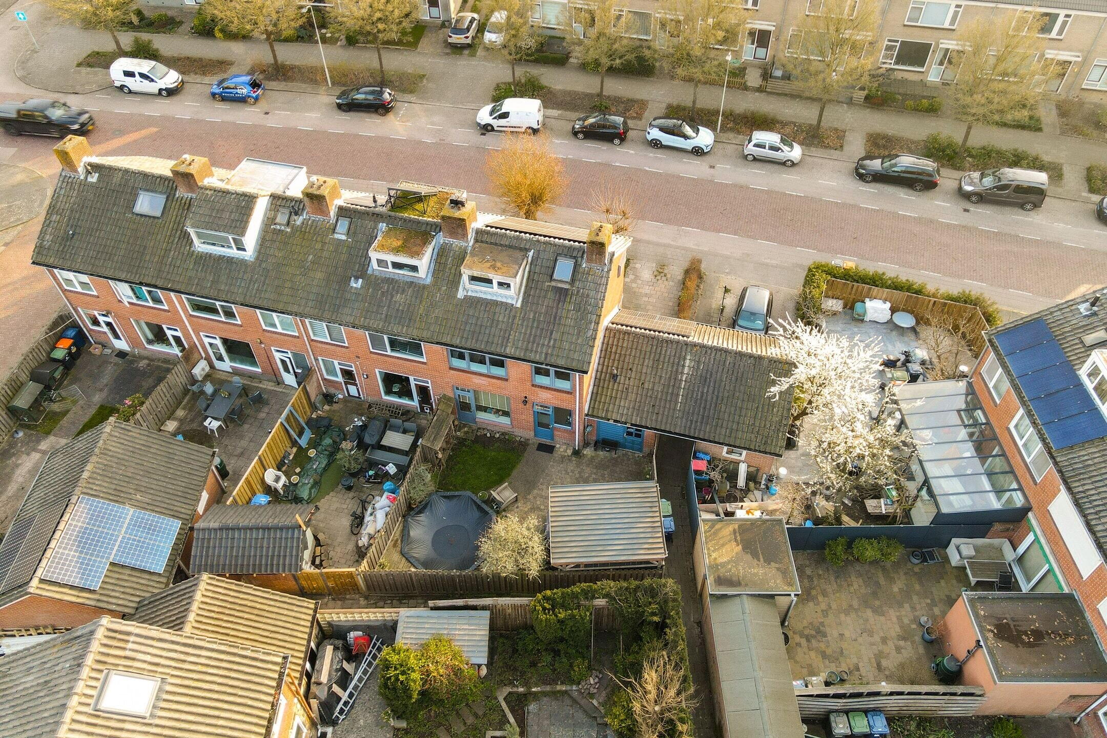 De voortuin (ca. 50 m²) is gedeeltelijk omheind met daarachter een plantenperk voorzien van vaste beplanting en siergrassen. De eigen oprit -inclusief een aan de zijgevel bevestigde laadpaal- biedt parkeergelegenheid en toegang tot de garage. Deze laatste beschikt naast de cv-ketel over elektra, water, een bergzolder en toegang tot de achtertuin..