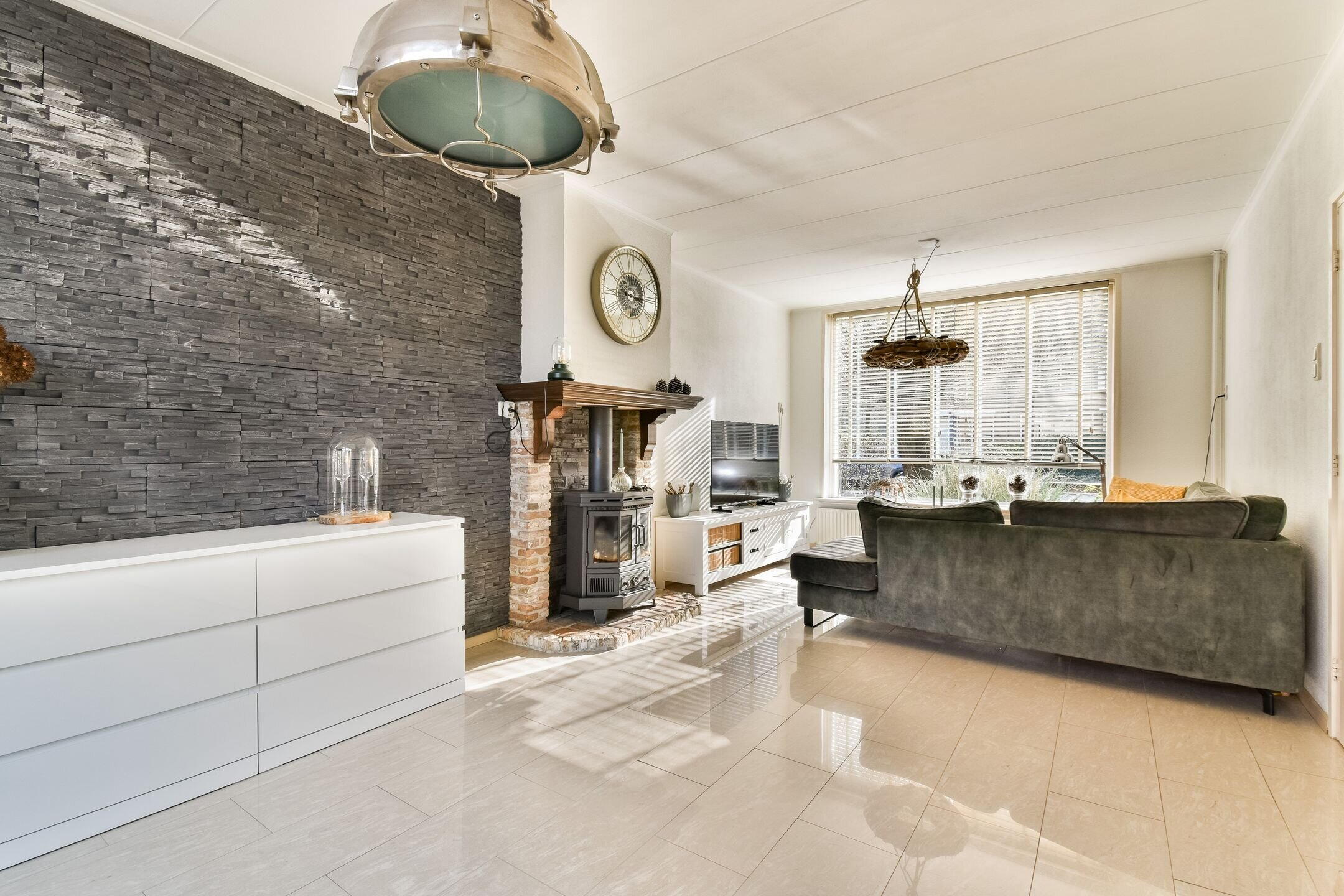 Keurige overdekte entree in de hal met garderobe, de meterkast, trapopgang, een praktische trapkast en de nette en deels betegelde toiletruimte met staand toilet en een fonteintje. De zonnige woonkamer heeft zowel aan de voor- als achterzijde grote raampartijen, waarbij je vanuit de achterzijde directe toegang hebt tot de fijne achtertuin. De woonkamer is verdeeld in een zitgedeelte en een eetgedeelte. Een fraaie schouw met houtkachel vormt de natuurlijke scheiding tussen beide ruimtes. De gehele begane grond biedt een doorgelegde plavuizen vloer met vloerverwarming. Ook vanuit de afgesloten keuken heb je direct toegang tot de achtertuin. De parallelle keukenopstelling is compleet uitgerust met onder meer een vaatwasser, een koel-vriescombinatie, combi-oven, magnetron, RVS spoelbak en een gaskookplaat met afzuigkap.